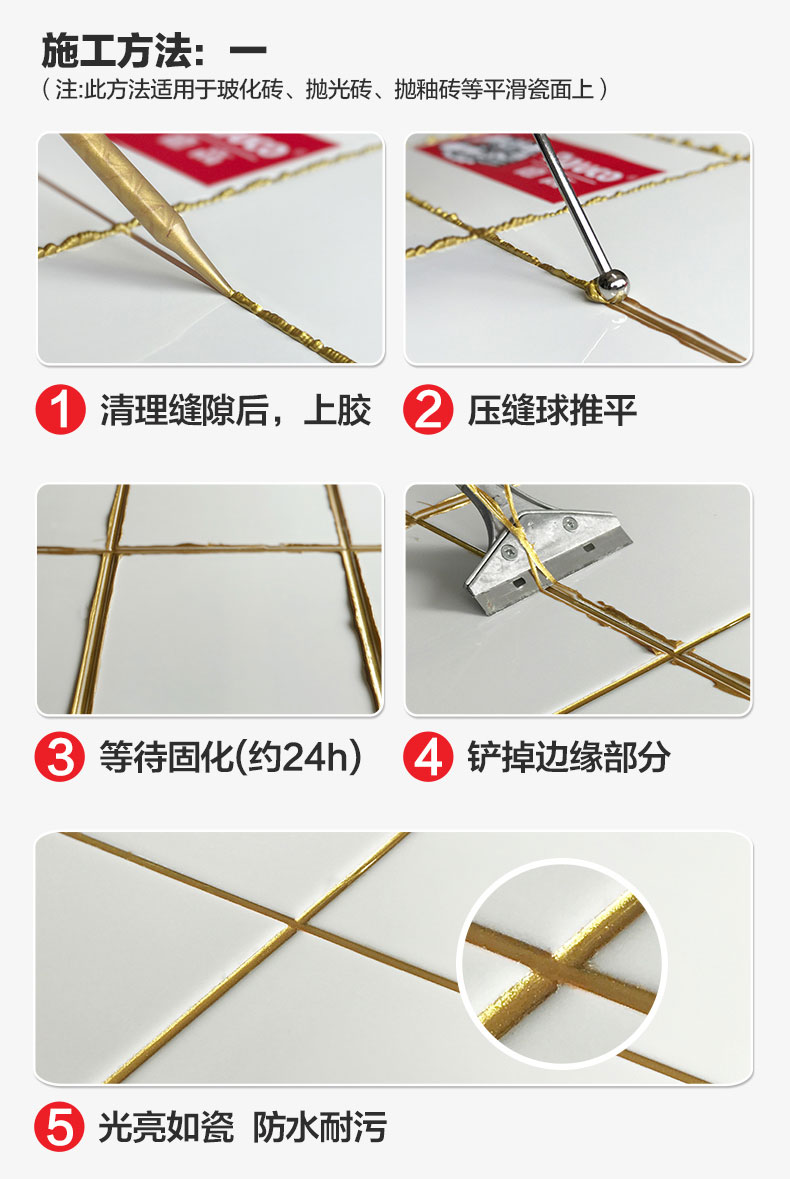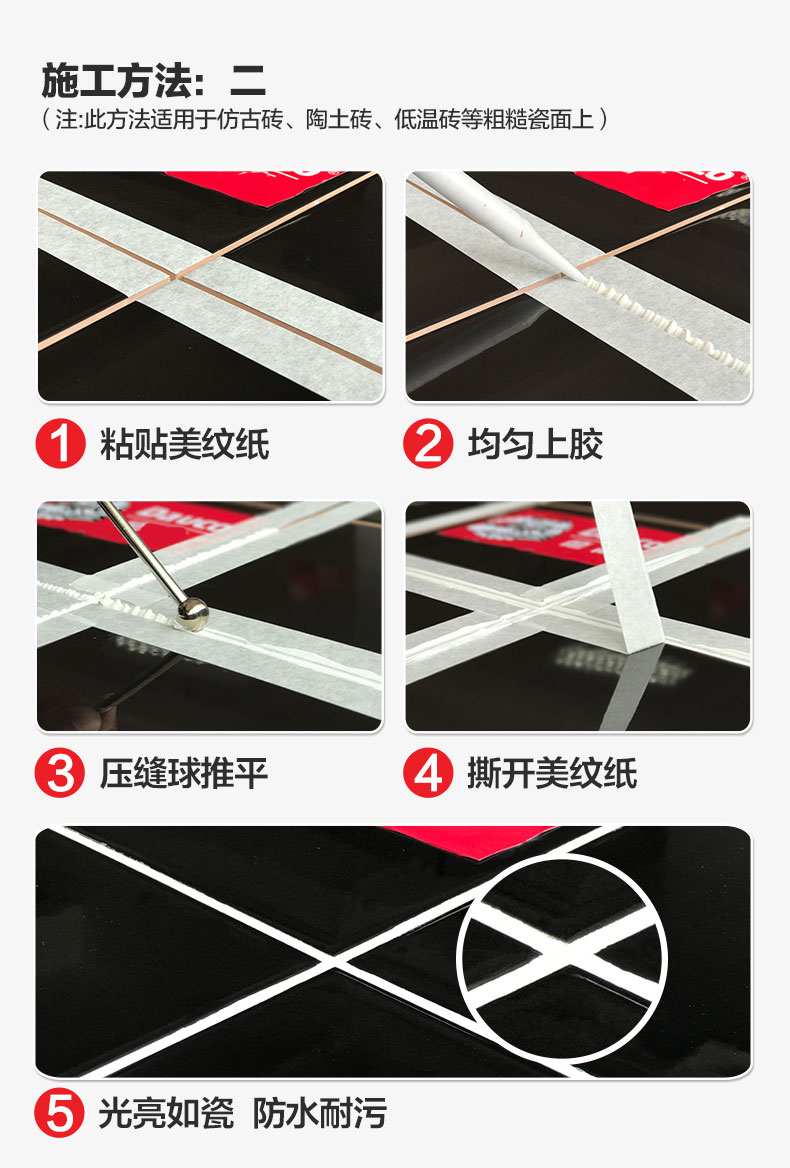 第二部:縫隙干燥后,打上美縫劑,用壓縫鋼球壓縫,等待8小時(shí)后,就可以鏟除余料了。如果是仿古磚、亞光磚可以使用美紋紙或者美縫蠟。