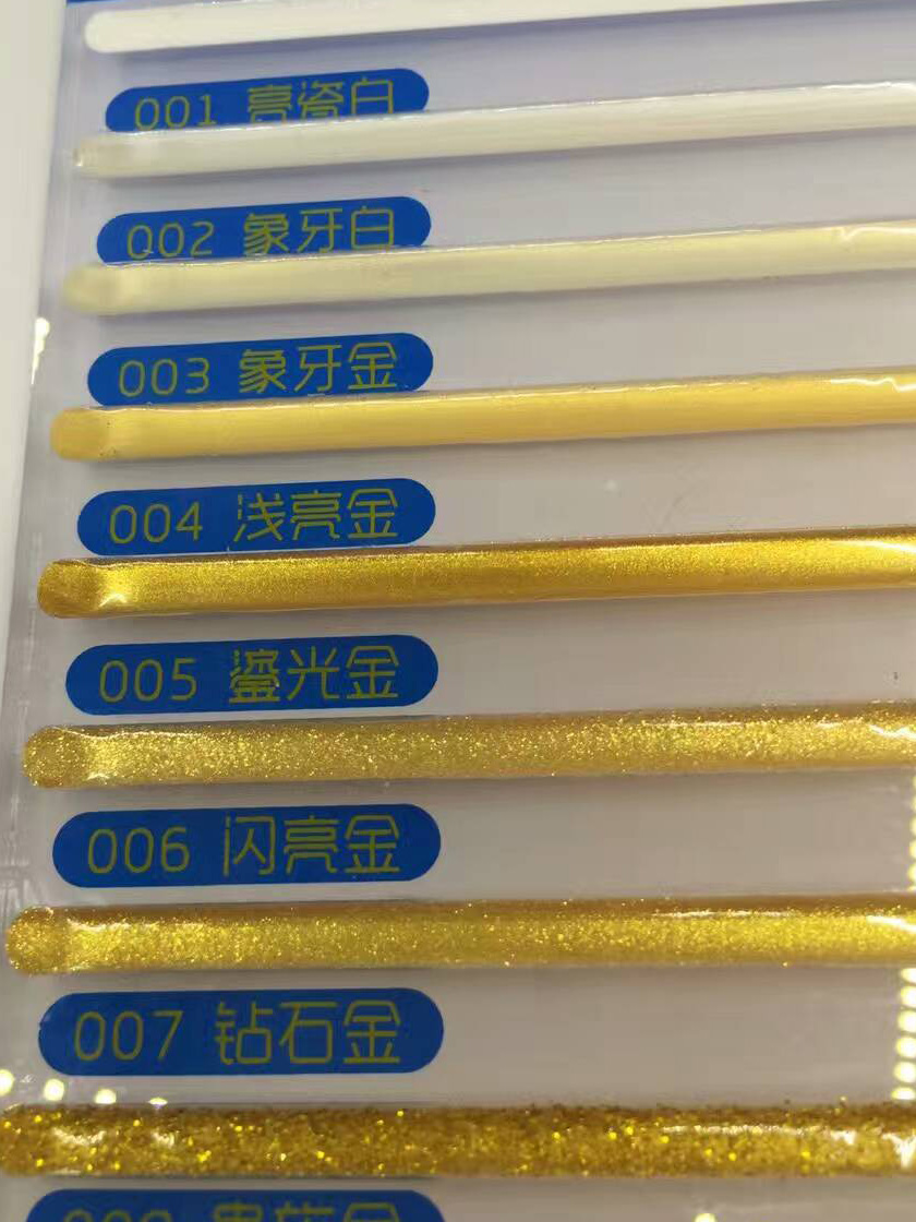 1、亮瓷白 2、象牙白 3、象牙金 4、淺亮金 5、鎏光金 6、閃亮金 7、鉆石金 8、貴族金 9、奢華金 10、香檳金 11、貴族銀 12、閃亮銀 13、寶石藍(lán) 14、淺亮灰 15、玫瑰金 16、咖啡棕 17、珍珠黑